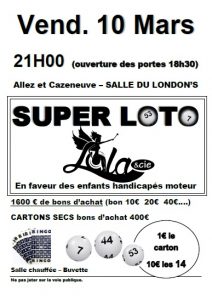 Venez fêter les 1ans de l’association Posted on26 février 2017 Auteur span>MARIECAROLINE Super Loto le vendredi 10 mars Salle London’s – Allez & Cazeneuve AFFICHE LOTO 10 MARS